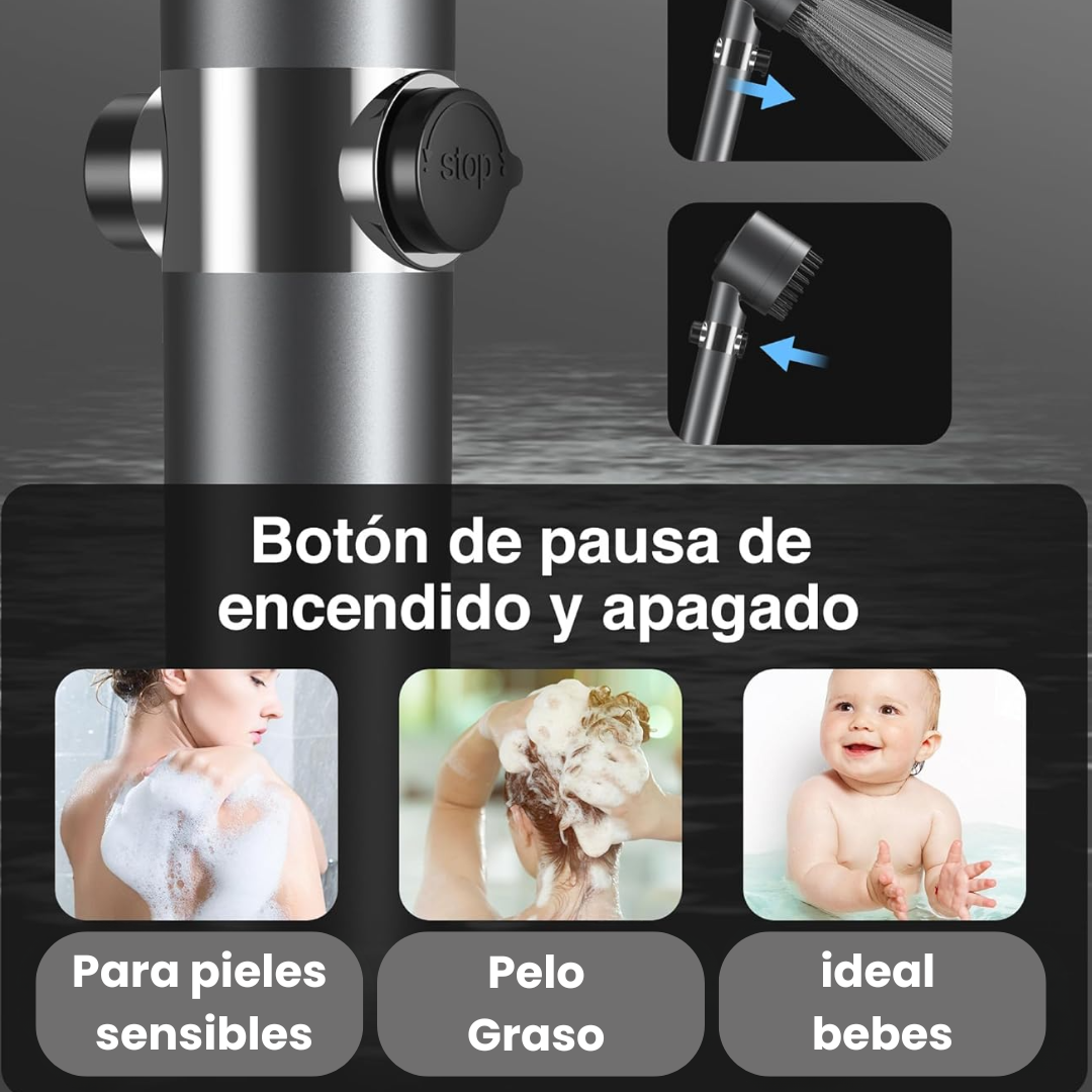 El filtro incorporado purifica el agua al instante, protegiendo tu piel de la cal y los químicos. Ideal si sufres de sequedad o irritación.